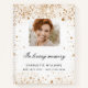 A stylish white background with faux gold glitter dust. With the text: In loving memory written with an elegant hand lettered style script. Add a name and dates, a photo.