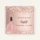 A guestbook for a feminine and glamourous Quinceañera, 15th birthday party. A stylish rose gold faux metallic looking background with faux glitter, sparkles and a girl wearing a princess dress, ball gown. Personalize and add your name, and age/date. The name is written with a hand lettered style script.
