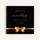 A stylish black background with a golden ribbon and bow. Personalize and add your names and wedding date.