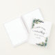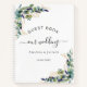 A white background colour. Decorated with eucalyptus greenery and golden foliage. Add your names and wedding date. Our wedding is written with a modern hand lettered style script.