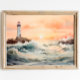 In this enchanting piece, the lighthouse stands tall and resolute, its beacon cutting through the mist as it watches over the tumultuous waves. The artist's masterful use of watercolors infuses the scene with a sense of movement and drama, inviting you to witness the unyielding strength of the coastal sentinel.