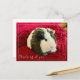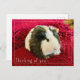 Guinea Pig Postcard. This cute cavy postcard features a young tortoiseshell silkie guinea pig sitting on red blanket with the words "Thinking of you". The words are editable if you wish so. Wonderful postcard for kids, guinea pig lovers, guinea pig pet owners, and animal lovers.