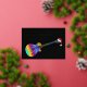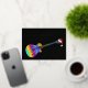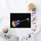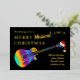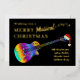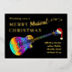Bring some festive guitar music cheer to the christmas season with this fun merry musical christmas modern black and gold foil holiday card. Funny hand drawn bright rainbow colours semi acoustic electric guitar wearing a Santa hat illustration with gold foil musical notes and typography script all easy to personalize with the template. Ideal for music loving families to send seasons greetings and for guitar players, music teachers and musicians. Original artwork by Catherine Sweetman