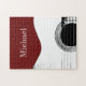 Musical jigsaw puzzle with a black and white guitar image. Set on a red background, white typography can be customized with your own text. A challenging gift for the guitar player in your life!