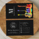 Guitar music teacher musicians business card with custom logo template and contact social media icon and details perfect for business networking. Psychedelic acoustic guitar, semi acoustic guitar and electric guitar in bright colours on a black background complete with personalized monogram, name, details and your logo. Cool modern musicians business card design for guitarists, professional musicians, entertainers and music teachers. Original artwork by artist Catherine Sweetman
