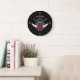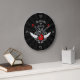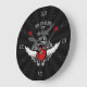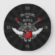 Horloge murale personnalisée sur le thème rock 'n' roll avec une illustration de style vintage de deux guitares rouges avec ailes et ornements floraux baroques. Les marques d'heure des chiffres romains peuvent être modifiées. Un cadeau fantaisie pour les accros de la musique !