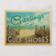 This Greetings From Gulf Shores vintage postcard design features a sandy beach with a beautiful turquoise ocean water and above the sea, a blue sky with billowy white clouds. In vintage travels style.