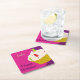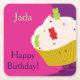 Coaster with a smiling gummy bear cupcake. This design has a pink and purple background. This item shows the words Happy Birthday and a customizable name.