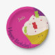 Paper plate with a smiling gummy bear cupcake. This design has a pink and purple background. This item shows the words Happy Birthday and a customizable name.