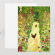 Card featuring Gustav Klimt’s oil painting Garden with Roosters (1917). Two brown chickens stand on a garden path. Beautiful pink, red, and white flowers bloom along the path. A great gift for fans of Art Nouveau and Austrian art.