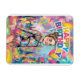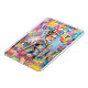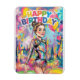 A lively and cheerful watercolor illustration of a gymnast girl dressed in a shiny, colourful outfit with intricate patterns and textures. The dreamy, abstract background features vibrant colours, floating balloons, hearts, and playful shapes. Above the girl, bold and colourful "HAPPY BIRTHDAY" text adds to the festive atmosphere. This whimsical and quirky artwork is perfect for birthday cards, party invitations, or decorations that radiate joy and creativity.