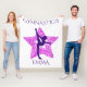 Purple gymnastics fleece blanket with gymnast and personalized name.