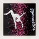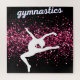 This girls gymnastics design has a solid black background with pink specs of faux glitter and a gymnast silhouette leaping into the air.