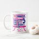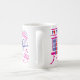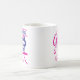 A stylish two design Gymnastics themed mug. Front: A rhythmic gymnast with ribbon that spells the word Gymnastics. (MUM). Back: I LOVE GYMNASTICS - VAULT, FLOOR, UNEVEN BARS, BEAM. - Design shows a gymnast with various gymnastic apparatus. (uneven bars, Vaulting box and Beam).