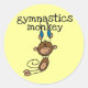 A cute brown stick figure monkey swings from the rings and text reads "gymnastics monkey" on monkey gymnast T-shirts, mugs, hoodies, cards, stickers, and other gymnastics apparel and gifts.