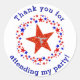 Gymnastics party thank you stickers- Reads 'Thank you for attending my party!' in modern, blue, curved lettering with shadow effect at top and bottom. Red and blue stars circle a faux sequins, red star with a tumbling gymnast pose in the centre. Matches red, white and blue party decor, gymnastics theme, cheerleader theme, or stars theme. Add any custom text you wish. Click Customize option to change text colours, size, and font styles. Cute, tumbling gymnast or cheerleader birthday party thank you favour tags.