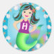 A cute little mermaid wearing a big "H" on her shirt, surrounded by a ring of sea shells and starfish.