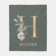 Letter H monogram floral. Letter H in golden brown texture accented with green watercolor compound leaves, flower blossoms and gold dust. Personalized with name in matching font.