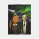 Inspired by the famous Grant Wood painting "American Gothic," this version features H.P. Lovecraft in overalls with a pitchfork, and his Mi-Go companion, in front of the Fleur-de-Lys house in Providence, RI (which featured in the story The Call of Cthulhu as the home of Wilcox). Behind them is an ominous sky of cosmic horror, and a cameo by a certain Colour, soaring towards the farm of Nahum Gardner. Fuzzy, fleecy, and full of horror to warm your lap.