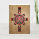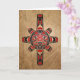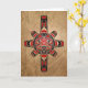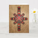 A Haida inspired sun design with a face at the centre. Eight stylized rays reach out from the middle of the star creating symmetrical pattern. The design is coloured the traditional read and black that is highlighted to create a light shine on the surface. A shadow falls onto the beige background making the mask appear to float just above the surface of this card. Two hands fall just beneath the tooth filled mouth which gives this native pattern an aggressive and stylish look.