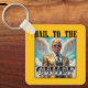 A majestic Trump, clad in a dazzling gold suit and pristine white shirt, stands with an aura of ethereal grandeur. The gleaming white angel wings extending from their back add a celestial touch, while the radiant rays of light piercing through the clouds in the background create an otherworldly glow. The phrase "HAIL TO THE" at the top and "CHIEF" at the bottom emphasizes the authority and reverence this figure commands. This image beautifully combines elements of divinity and leadership, evoking feelings of inspiration and awe.