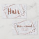 A modern, stylish hair stylist referral business card with modern hand lettering style brush typography in faux rose gold foil on a trendy and elegant white marble background with frame geometric border. If you need any customization, don't hesitate in contacting me