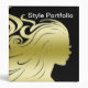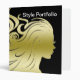 Beauty hair salon hairstyle presentation book with black background colour you can change and simulated gold hair style portrait graphic women along with text you can customize or personalize. Gives your presentation binder style and character. Designed for hair stylists, beauty consultants, or hair and nail salons.