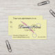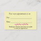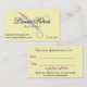 Minimalist hair stylist, pale yellow business card featuring modern script name and scissors with tiny pink flowers. Reverse side has "your next appointment" date and time.
