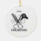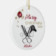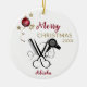 Salon Hairdresser Scissor Comb Hairdryer ceramic ornament. Black and white ornament for the salon professional. Cute and Unique. Features comb, scissors and hairdryer in black. Enhanced with a red snowflake bulb with ribbon and gold stars. Script calligraphy, Customize Merry Christmas and the year along with the person's name. A perfect gift for the salon professional.