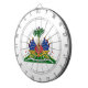 This design features the national coat of arms of Haiti (officially known as the Republic of Haiti), which is a country on the island of Hispaniola in the Greater Antilles archipelago of the Caribbean Sea. Haiti is located to the east of Cuba and Jamaica and south of The Bahamas and the Turks and Caicos Islands. Haiti occupies the western portion of Hispaniola, the island it shares with the Dominican Republic. Haiti is the most populous country in the Caribbean. The capital and largest city of Haiti is Port-au-Prince.