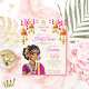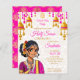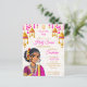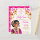 Half Saree ceremony budget template invitation cute Indian girl in traditional clothes cartoon with golden bells and cerise tassel garlands Ganehsha