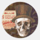 Halloween skull wearing top hat, skull and cross bones poison label, bats