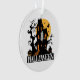 Halloween, entrez dans l'humeur éffrayante. Une scène d'Halloween éffrayante se déroule avec la silhouette d'une maison hantée sur fond de lune orange vif. La maison, avec ses fenêtres menaçantes et une figure fantomatique flottant à l'extérieur, est haute et mystérieuse. Deux arbres nus, leurs branches tendues comme des doigts squelettiques, encadrent la maison, ajoutant à l'atmosphère étrange. Un citrouille sculpté avec un sinistre sourire se trouve au premier plan, ajoutant une touche d'horreur ludique. Le mot "HALLOWEEN" est enroulé à travers le fond, avec des toiles d'araignée, ce qui signifie le charme éffrayant du jour férié.