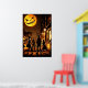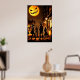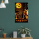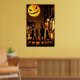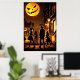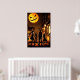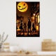 People dress up for Halloween and walking in the street in the city at night with a pumpkin moon in the sky. This is a AI generated art. Halloween themed art