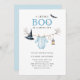This charming Halloween baby shower invitation is the perfect way to welcome a baby boy during the cozy fall season. Featuring delicate watercolor artwork of a witch’s hat, bat, and a baby blue cloth strung across bare autumn branches, it adds just the right touch of spooky cuteness. The playful "A Little BOO Is Almost Due" headline, paired with soft neutral tones and subtle Halloween elements, makes this invite ideal for gender-themed showers with a magical twist. Sure to impress your guests and set the tone for an unforgettable baby shower!