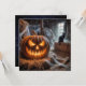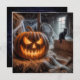 A large jack-o'-lantern with a menacing expression glows in a dimly lit barn filled with hay bales and cobwebs and a black cat in the background.