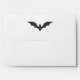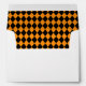 Halloween envelope featuring an inside chequered pattern in orange and black, and on the flap a bat.