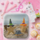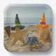 Pair of starfish on the beach with brooms, black kettle, and witch hats.