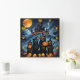 Four bears in wizard hats hold carved pumpkins near a haunted castle under a full moon, creating a whimsical Halloween atmosphere.