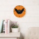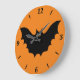 Large Round Wall Art Clock and home furnishing decor accessory with Halloween Black Bat artwork design image by TheFabricSeal at Zazzle.com is a cute and simple lone black bat illustration art drawing silhouette style with peekaboo peering khaki green and pumpkin orange eyes looking out for friends and prey alike and a cool dark Halloween night of adventure, goblins, ghouls, and trick or treat sweets.
