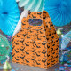 Make your Halloween Party complete with this gift box full of Halloween goodies. This gift box has an orange background with black bats flying on it. Perfect for any Halloween party.
