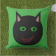 This awesome vibrant outdoor pillow features a black cat with pointed ears, bright green eyes and a sly red grin. This creepy kitty is perfect for Halloween or for cat lovers.