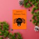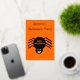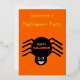 This beautiful foil Halloween Party invitation features a spooky black spider with eight hairy legs, yellow eyes with big black pupils and its mouth open showing its fangs. There is orange text that reads “Happy Halloween” and a matching orange background. The custom text on the front is in beautiful gold foil. There is additional text on the back so you can include all the details.