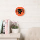 This awesome clock features a spooky black spider with eight hairy legs, yellow eyes with big black pupils and its mouth open showing its fangs. There is orange text that reads “Happy Halloween” and a matching orange background.