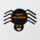 This awesome shaped Halloween window cling features a spooky black spider with eight hairy legs, yellow eyes with big black pupils and its mouth open showing its fangs. There is orange text that reads “Happy Halloween”.