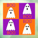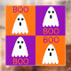 This awesome shaped window cling features a cute little white ghost with black eyes and a black mouth that is wide open. Each ghost sits on either an orange coloured square or a purple coloured square and there is either orange or purple text in each square that says Boo! The result is a pattern of squares and ghosts.