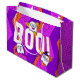Celebrate a cute and spooky holiday with this Halloween-themed gift bag featuring orange and purple stripes, cute ghost characters, and the word "BOO!" on the front and back. This giftbag is perfect for a Halloween party, birthday, or any occasion to share a Halloween themed gift. Characters are cute, sweet, and sure to bring a smile to any child or adult's face.