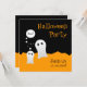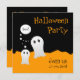 Halloween Party invitation template with funny cartoon ghosts and speech bubble on black and orange.