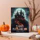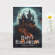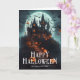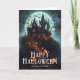 Imagine a captivating Halloween greeting card that conjures up an atmosphere of mystery and enchantment. The card features a stunning illustration of a grand castle perched on a cliff, surrounded by an eerie and magical landscape.
