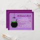 Halloween Cauldron invitation features a black cauldron in which a greenish liquid is brewing, and over which a black spider with scary protruding eyes, is dangling. The card has a purple background. © Morning 6